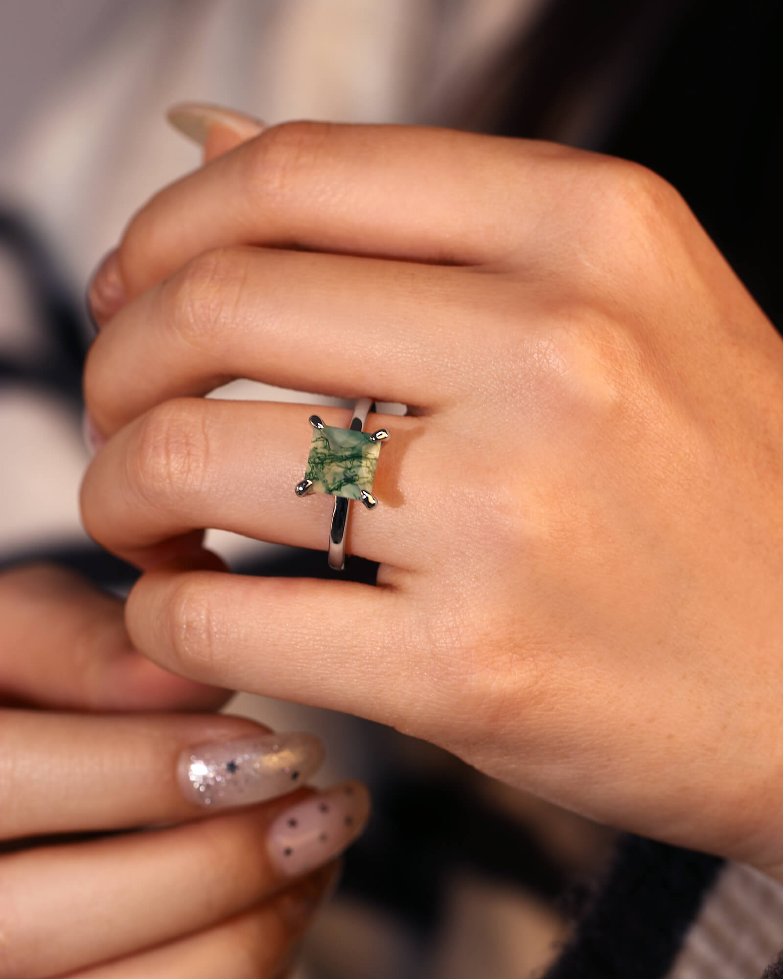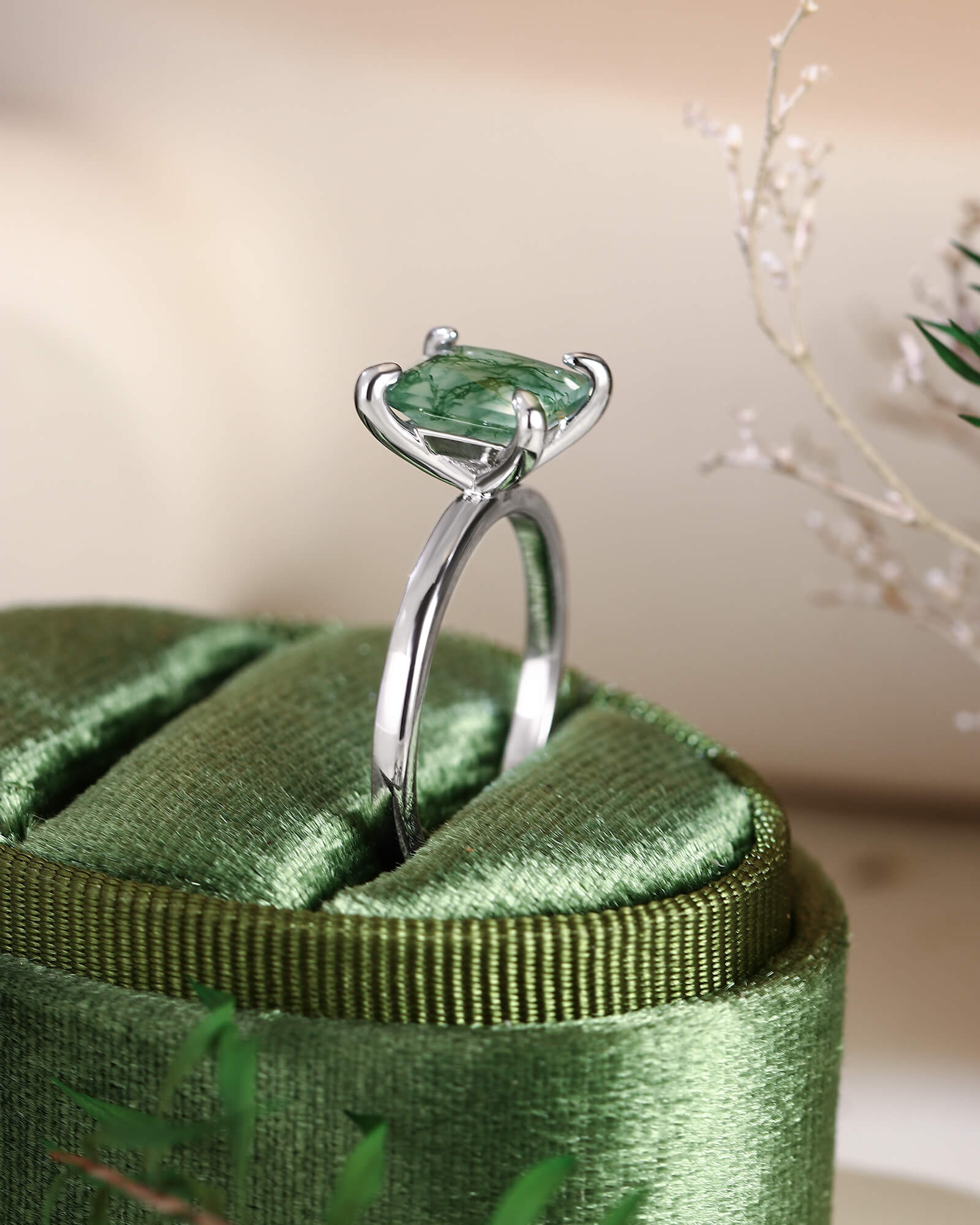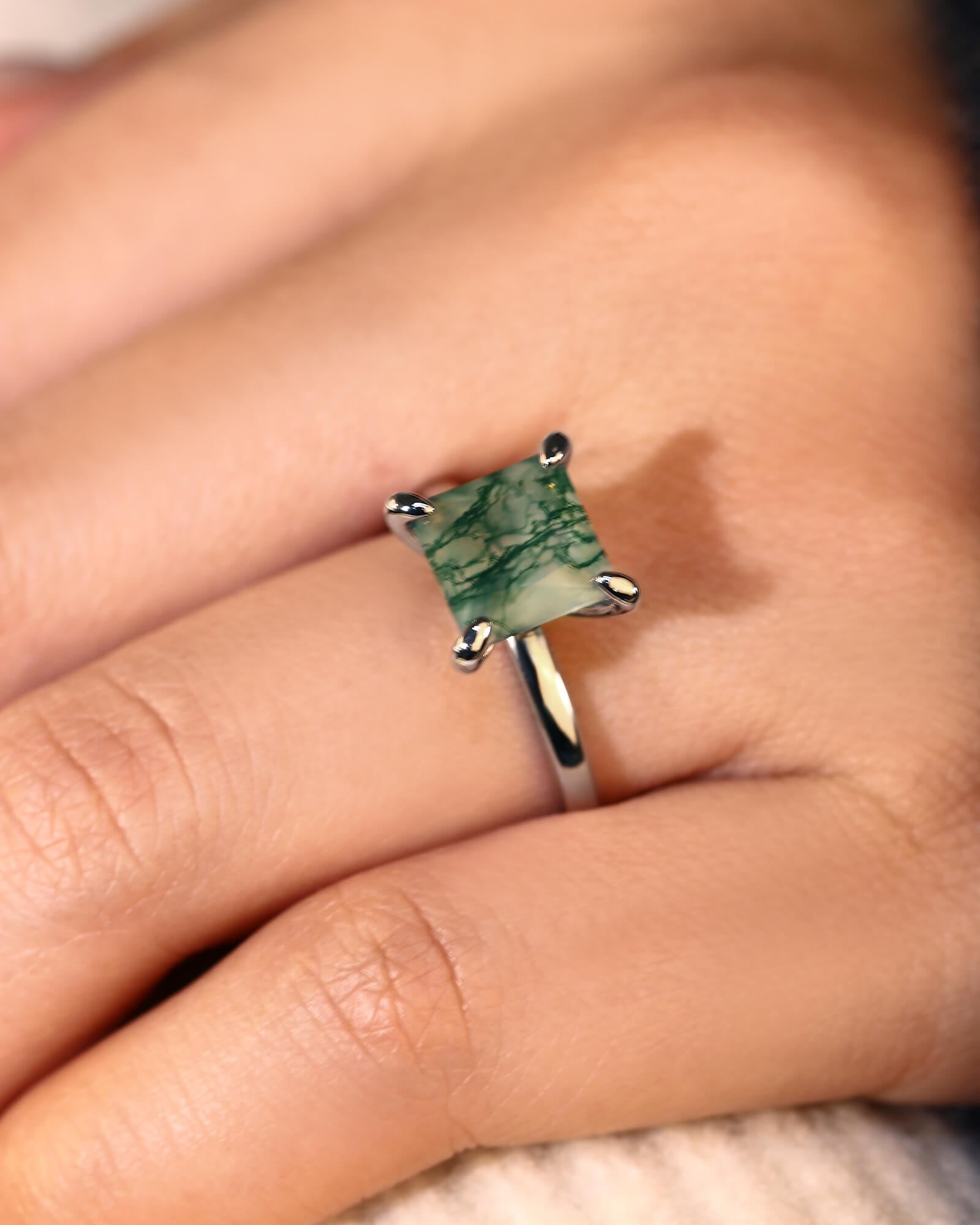 A princess cut moss agate, with its sharp geometry and serene green depths, stands alone in elegant simplicity. This solitaire is for the love that is both precisely true and beautifully untamed.