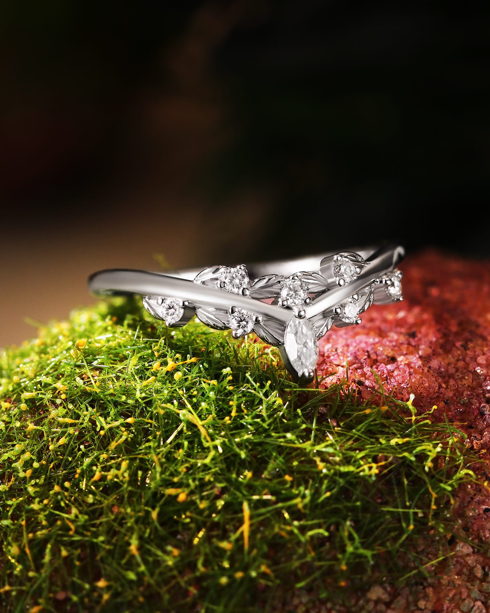 The RILEY wedding band is a poetic interpretation of organic elegance, designed for those who find romance in the natural world. Drawing inspiration from the graceful form of a leaf, the band features a stunning marquise cut moissanite diamond at its center, meticulously set to mimic a leaf's delicate tip. This central stone is elegantly flanked by a series of round cut moissanite diamonds that trace the band's curve, resembling dewdrops glistening along the edge of a leaf.