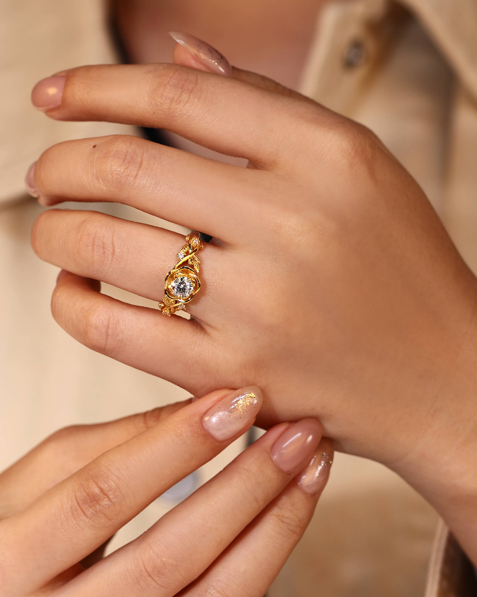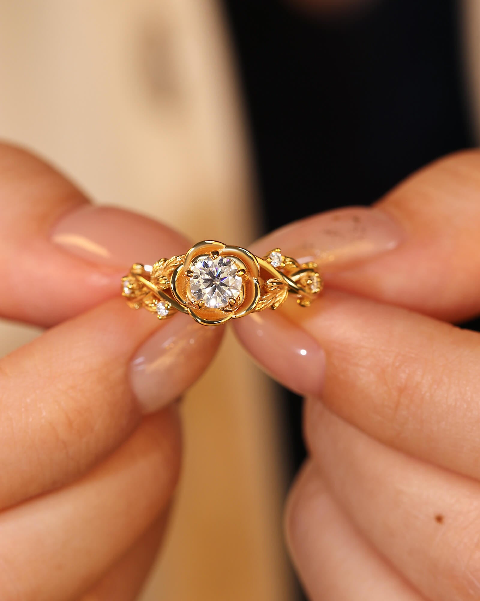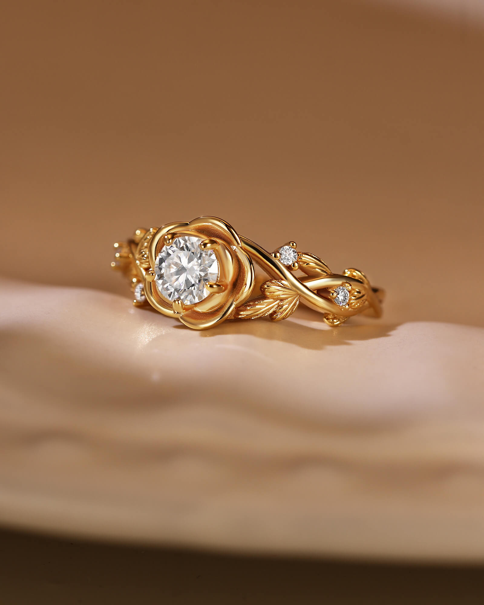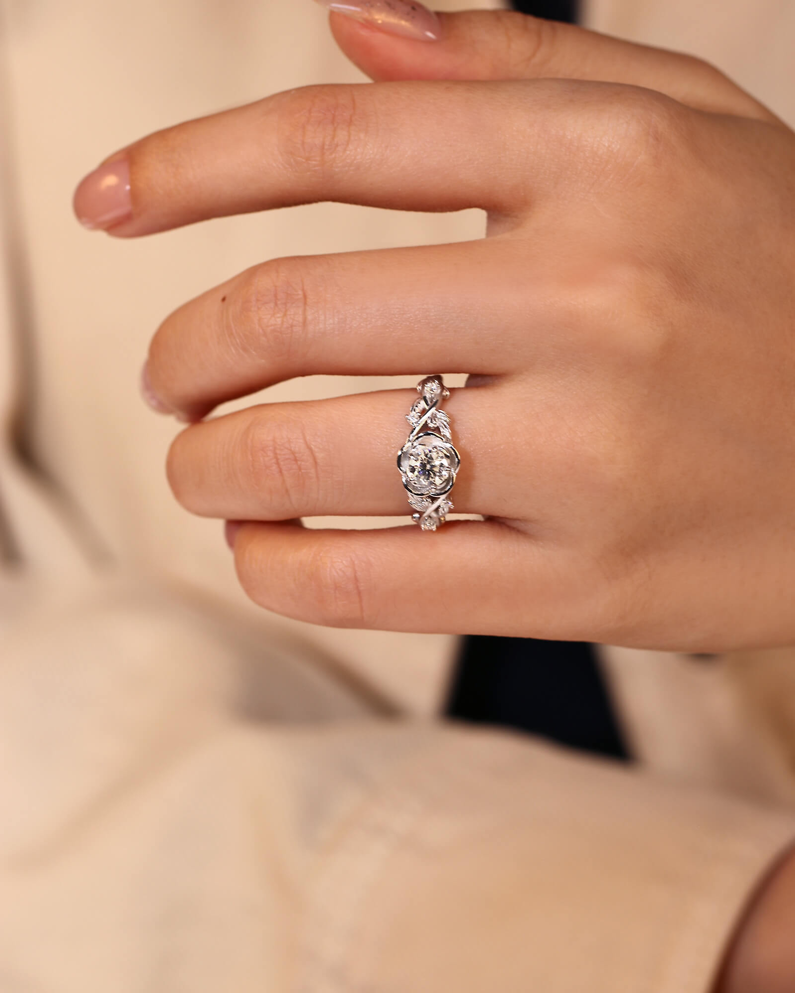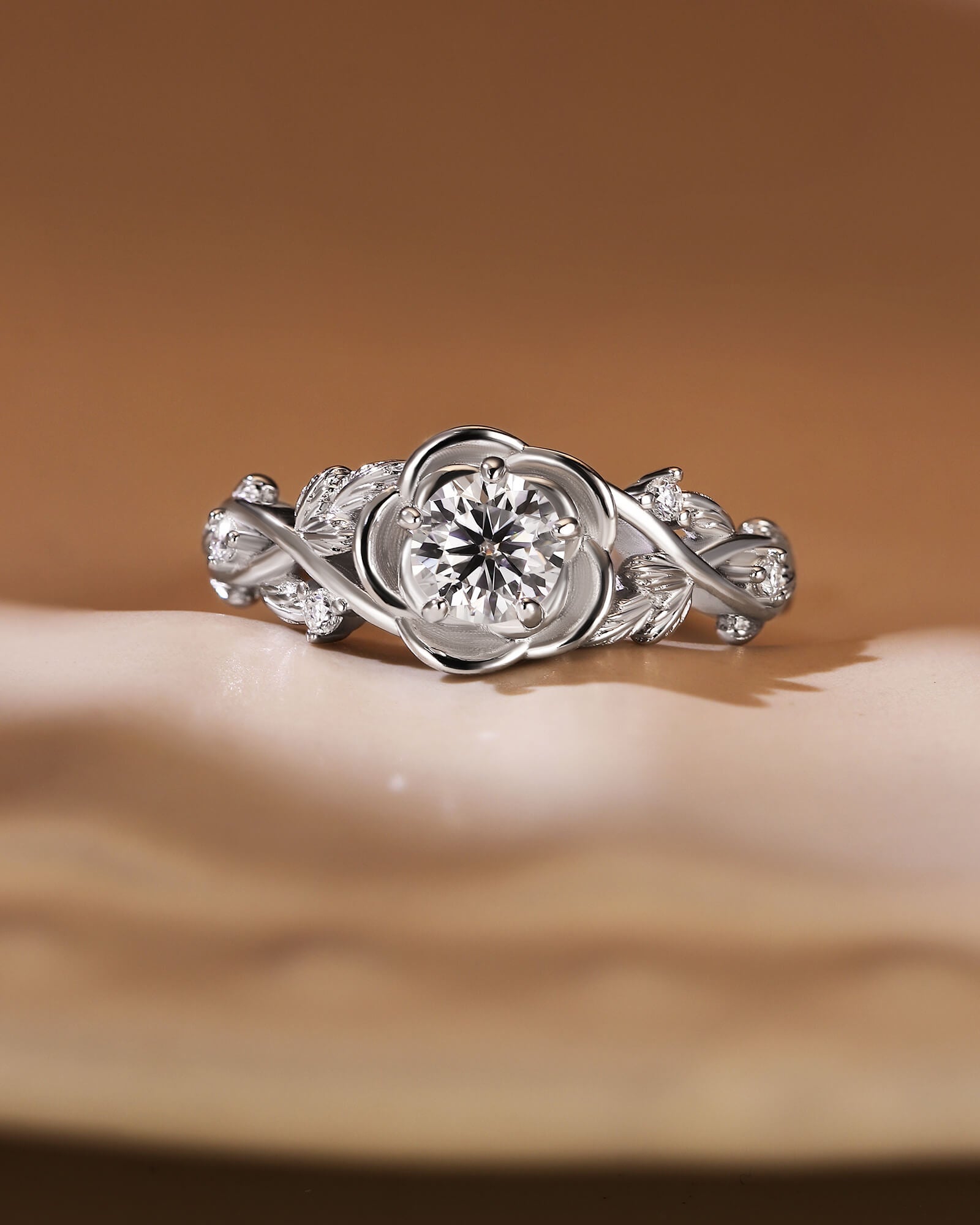A luminous round moissanite blooms at the heart of an ornate floral top, set upon a band of delicate, intertwining vines. This ring is a wearable fairytale of timeless romance.