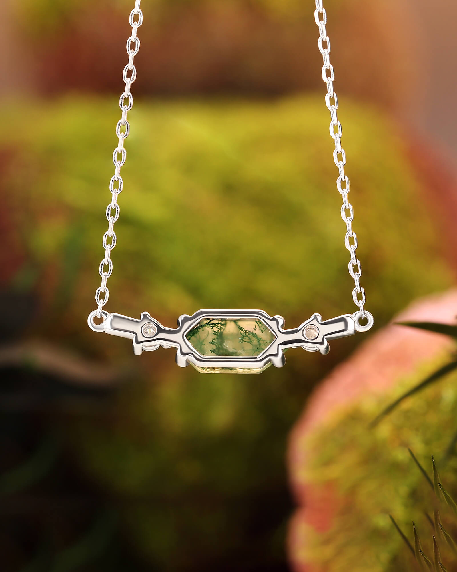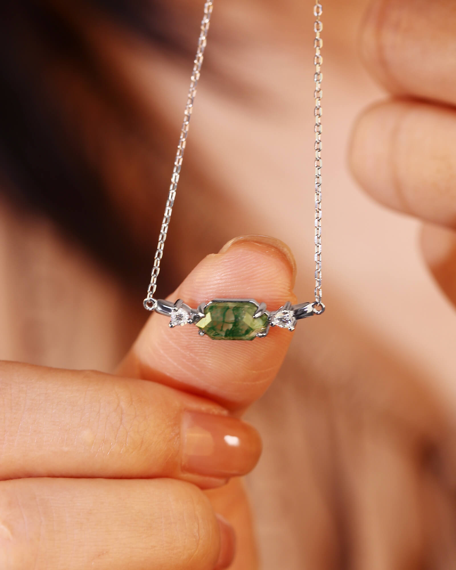 The ROSEMARY pendant necklace is a study in perfect balance, where organic tranquility meets geometric precision. Centered by a striking long hexagon moss agate cut to mirror the calm expanse of a horizon, this piece captures a moment of serene stillness. Within the stone, misty green inclusions create ever-shifting landscapes, making each pendant uniquely poetic.