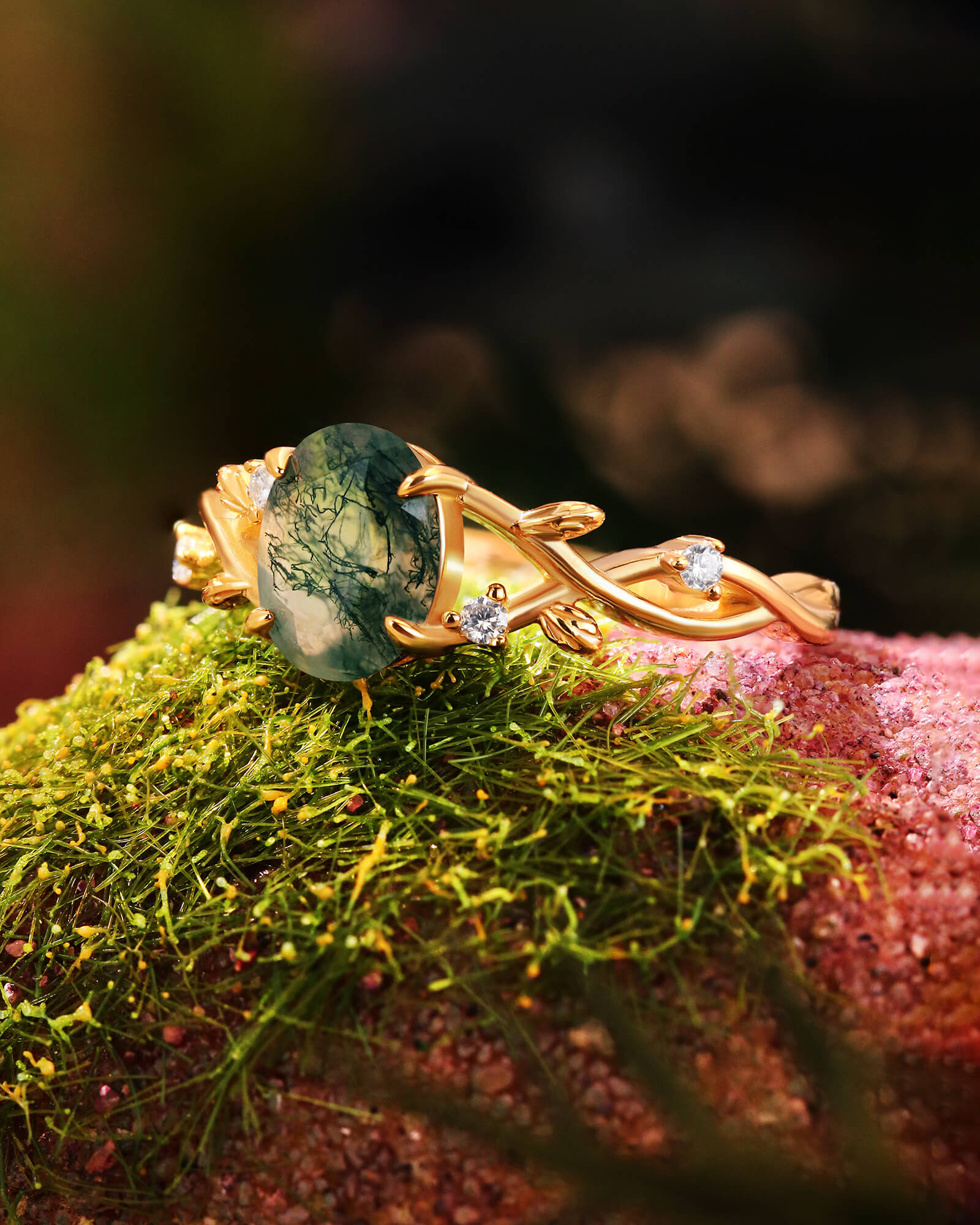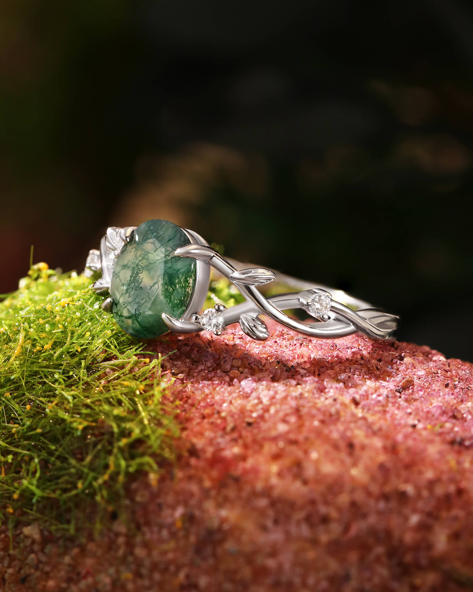 Oval Shaped Moss Agate Engagement Ring Moissanite Side Stone Ring Nature Inspired Leafy Shank Ring Promise Bridal Anniversary Gift For Her