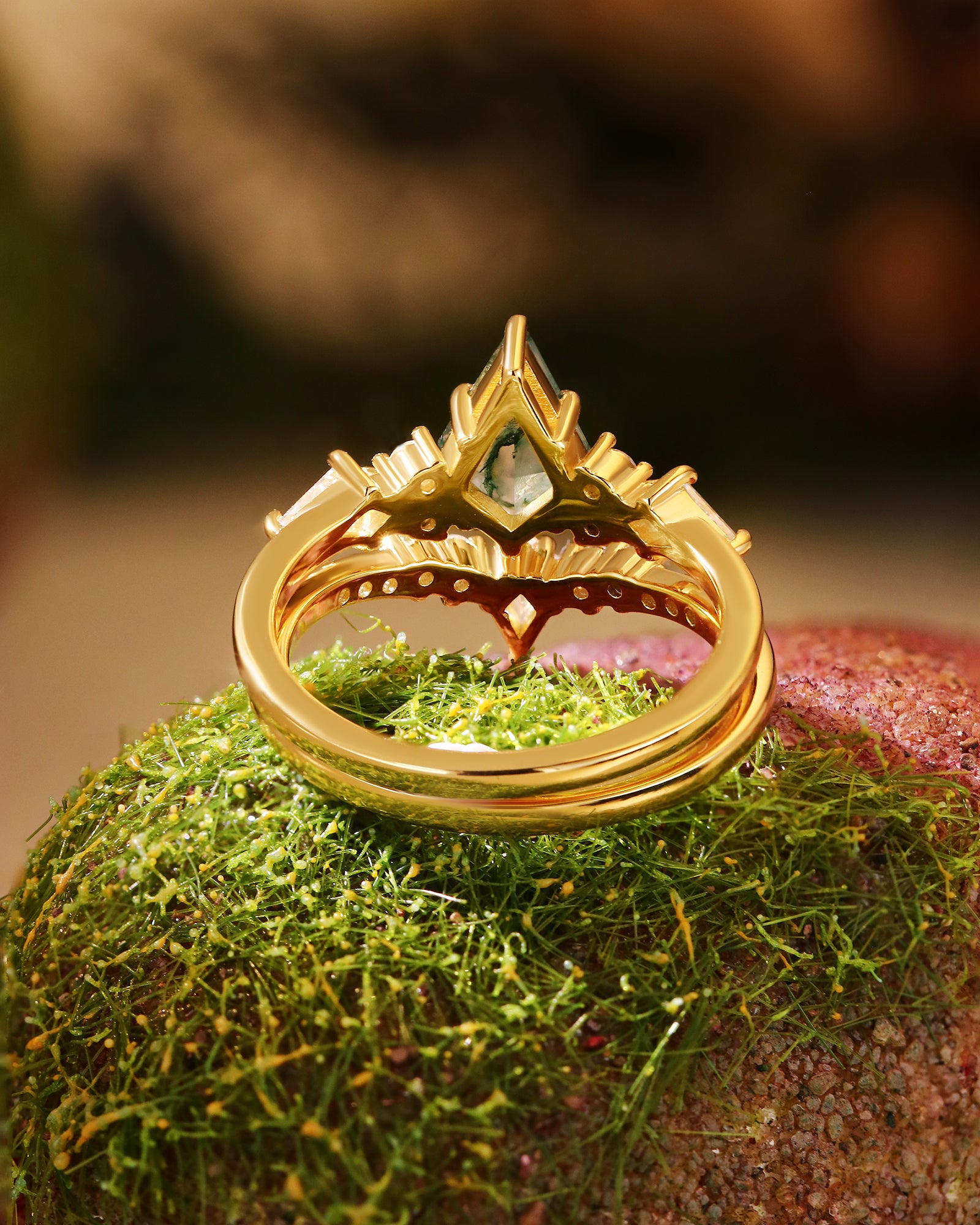 Unique Kite Cut Moss Agate Ring Set 2pcs Wedding Ring Moissanite Curved Band Ring Nature Inspired Ring Promise Bridal Anniversary Gift For Her
