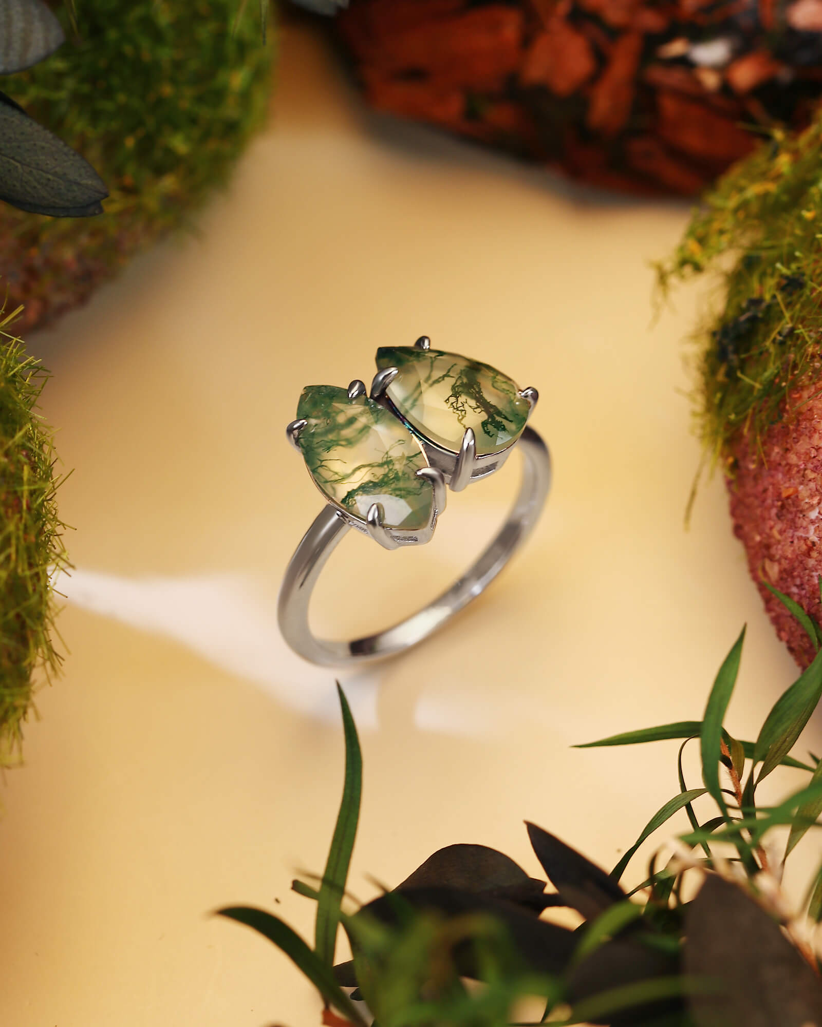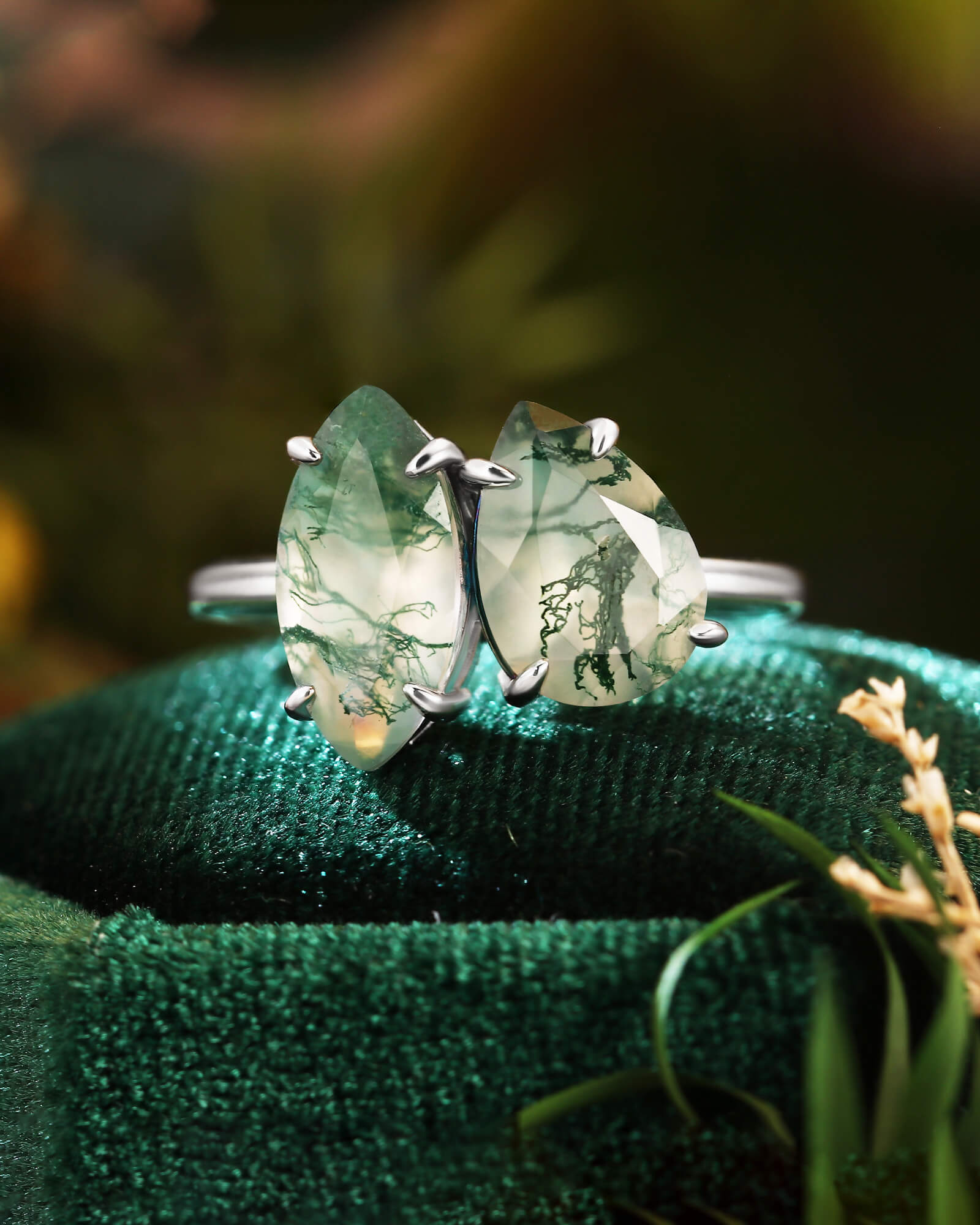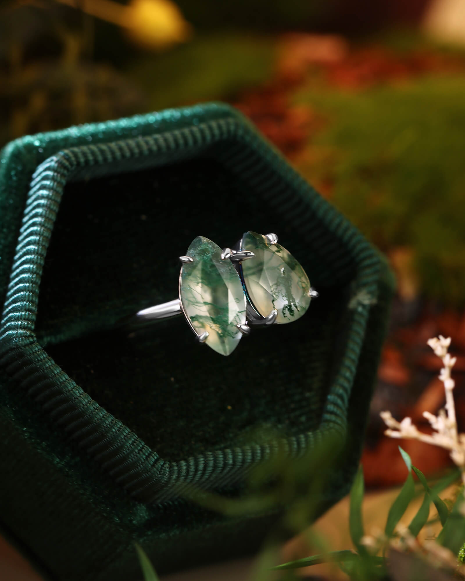A marquise and a pear cut moss agate unite in a fluid Toi et Moi design. This ring captures the essence of two souls dancing in perfect harmony—one bold and celestial, the other soft and grounded.