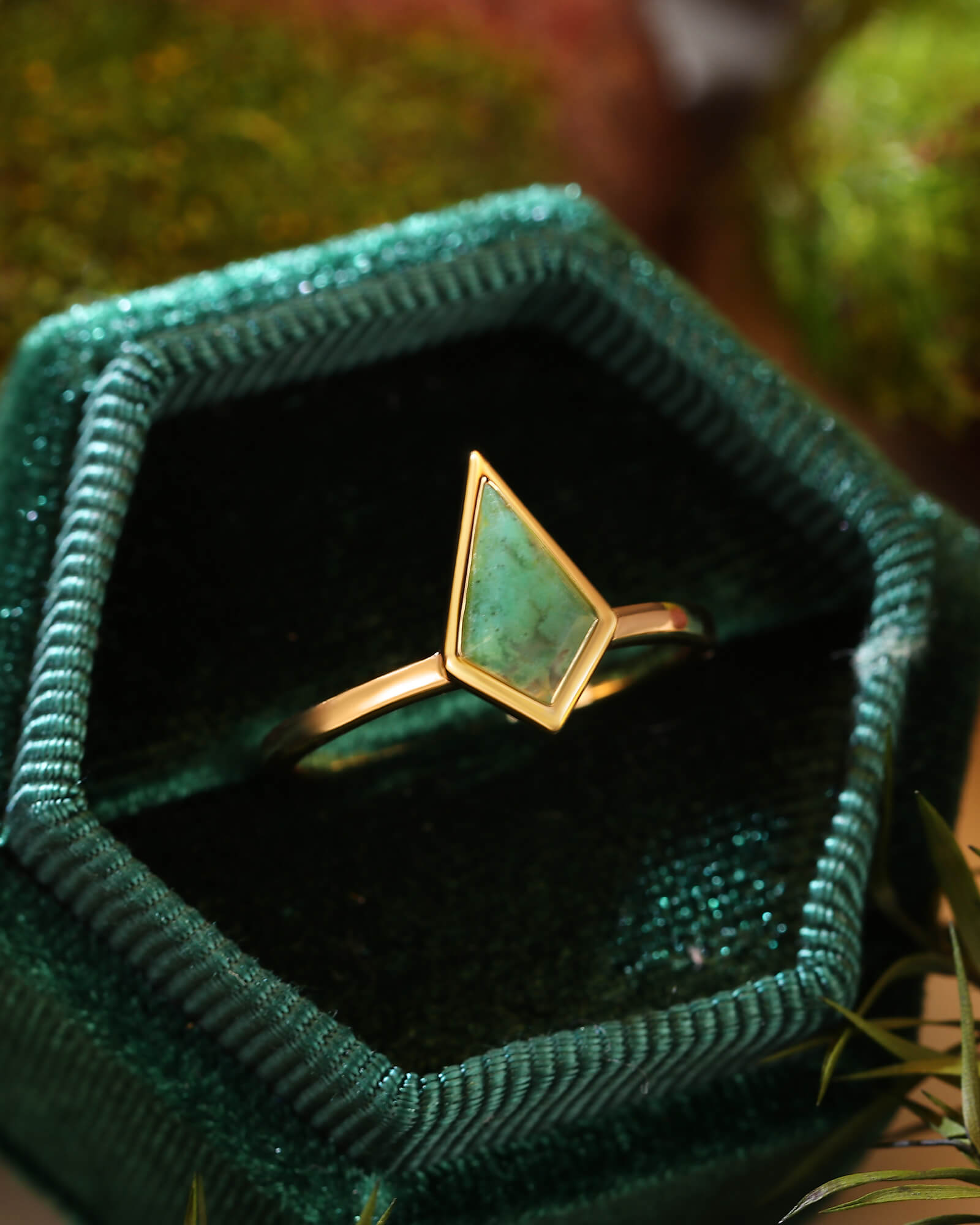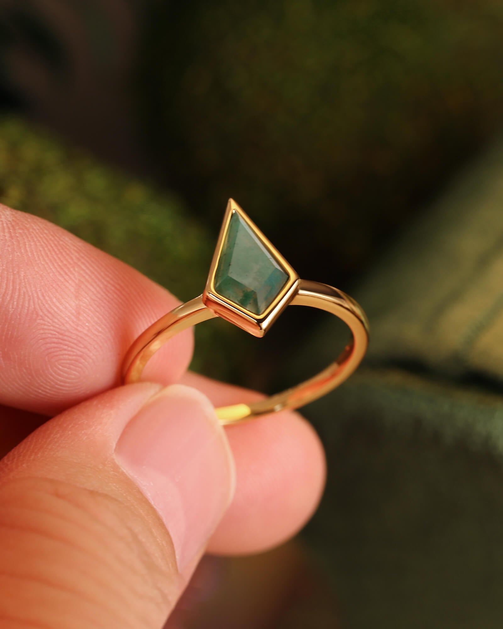 > The SILVABELLE ring features a stunning kite-cut moss agate, its organic patterns showcased in a modern bezel setting. A singular piece of wearable art for the modern fairy.