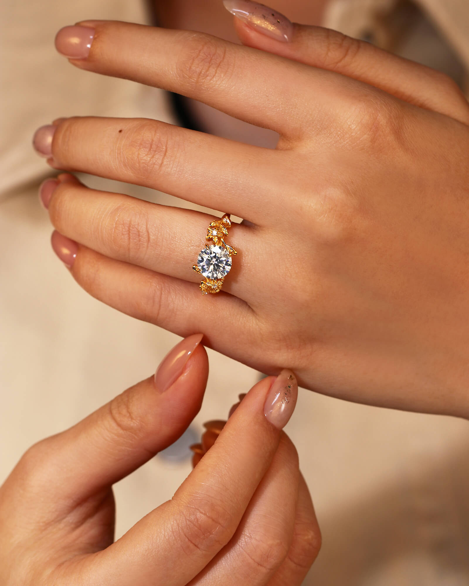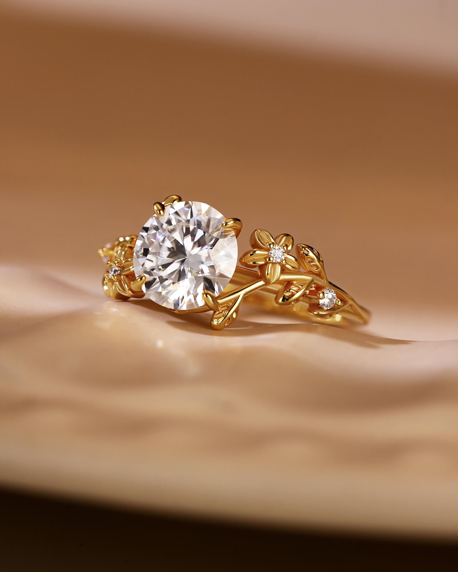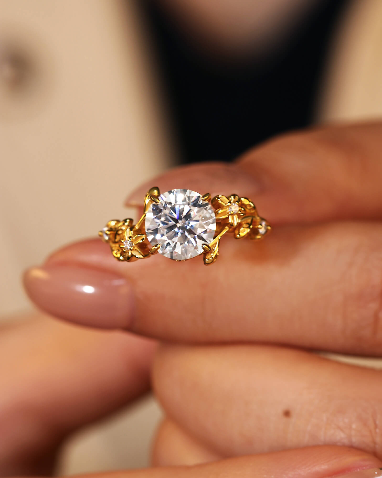 A brilliant round moissanite, inspired by the heart of a sun-drenched flower. This ring captures the joy of a new beginning, radiating warmth and happiness like a perpetual summer day.