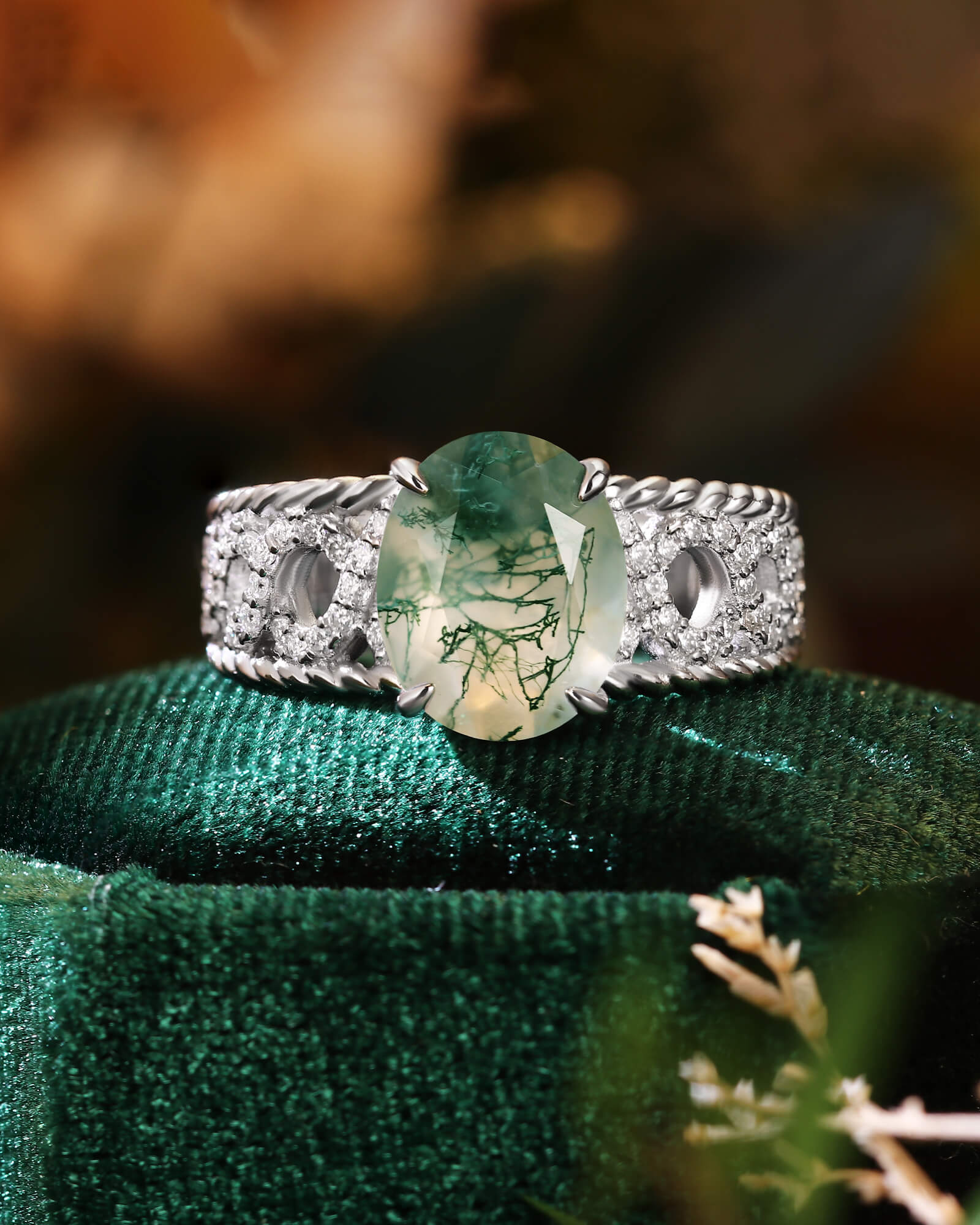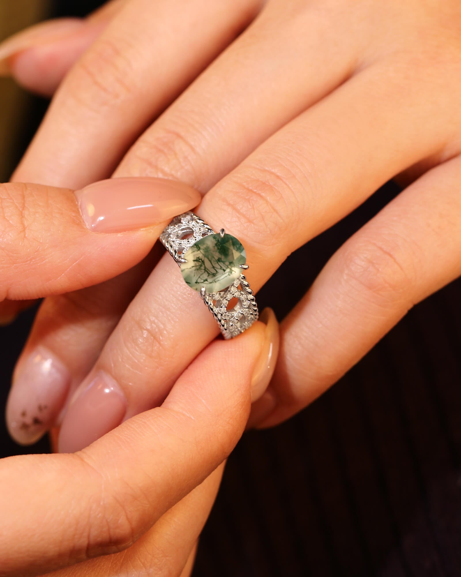 - Center Stone: Natural Moss Agate
