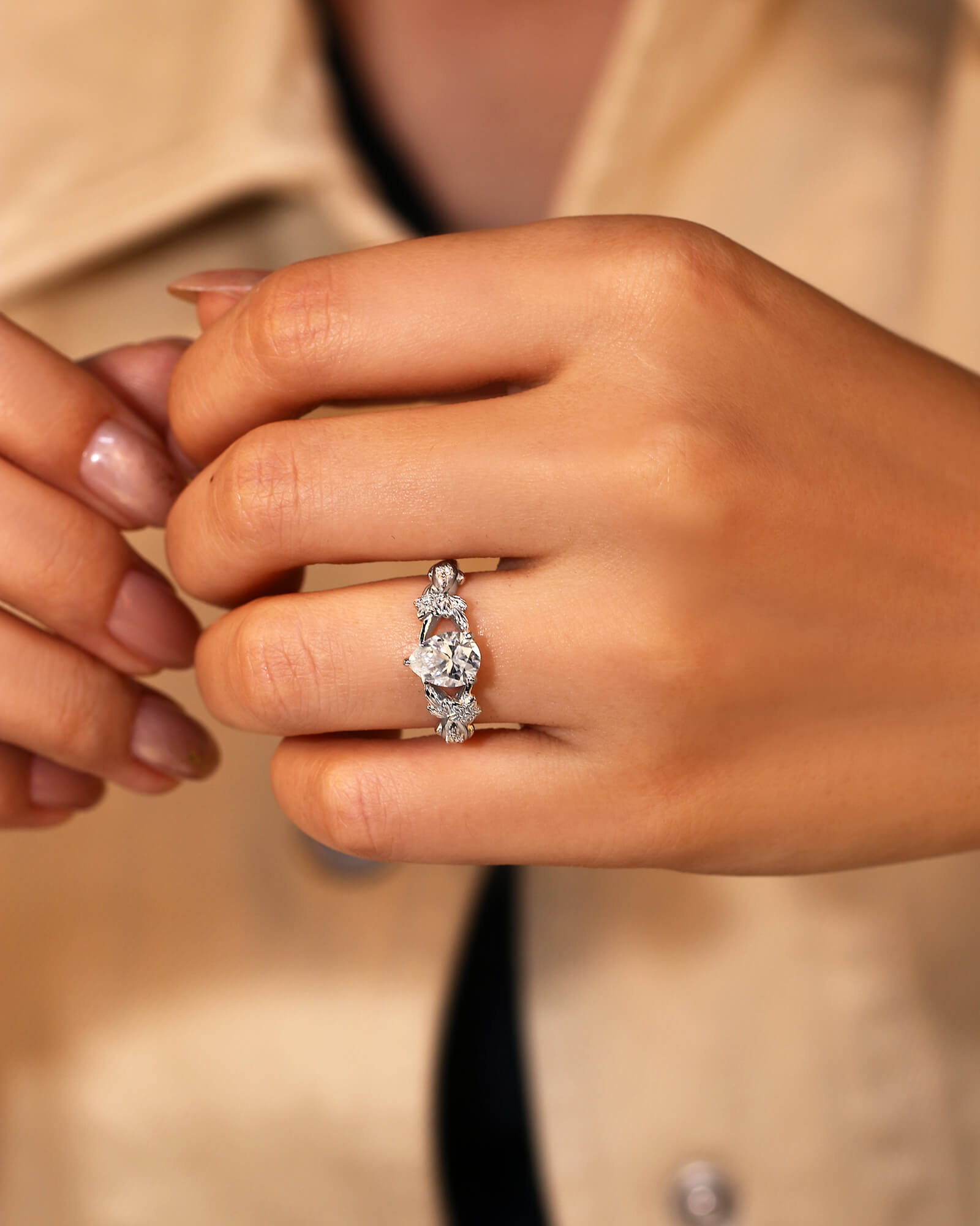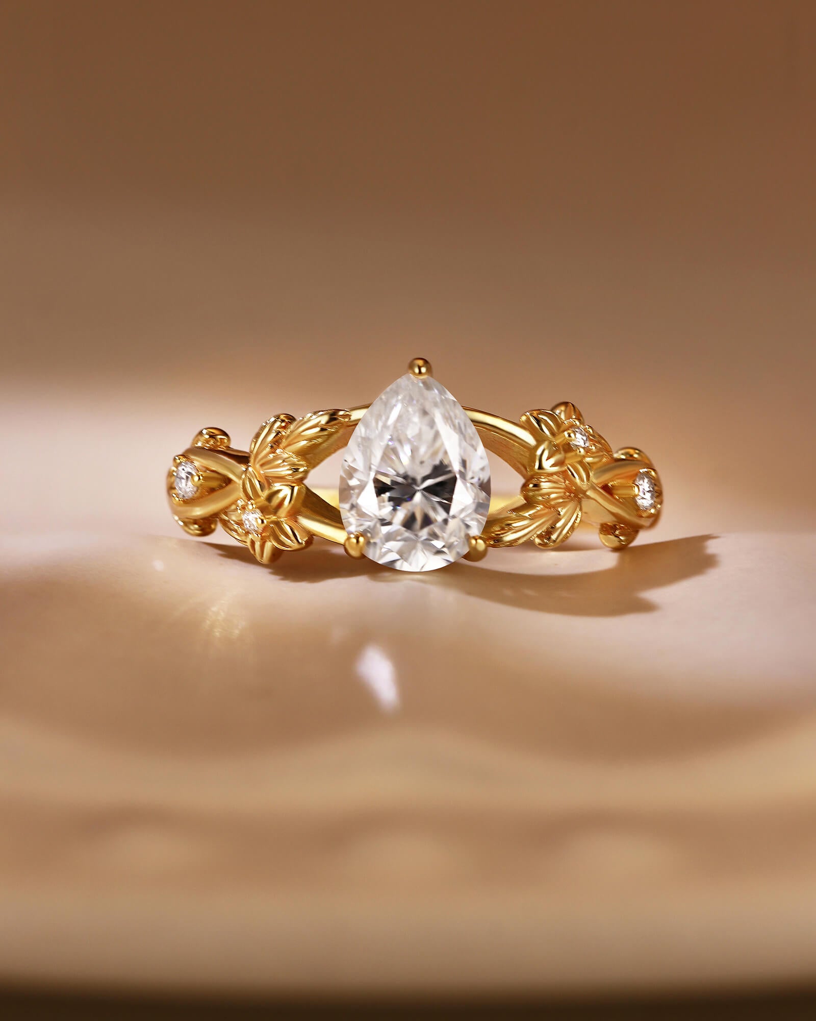 A pear cut moissanite, glowing like a captured dewdrop, rests within an enchanted garden setting of delicate leaves and vines. This ring is a wearable escape to a place where love grows wild and free.