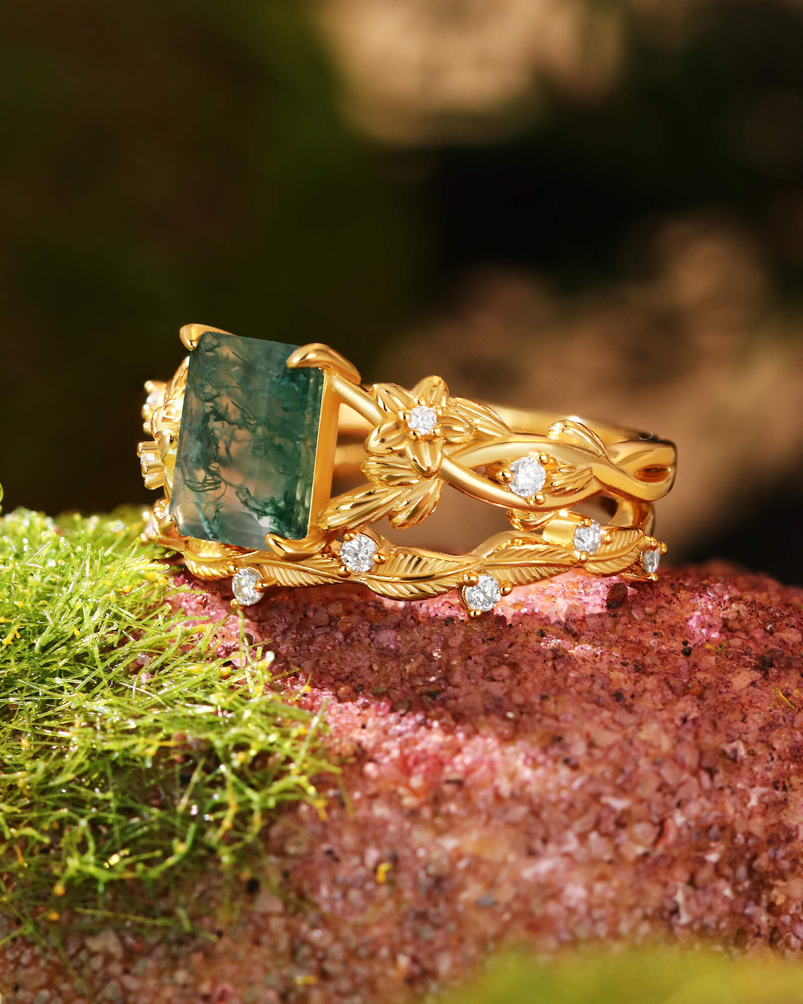 Unique Emerald Cut Moss Agate Ring Set 2pcs Wedding Ring Moissanite Leaves Band Ring Nature Inspired Ring Promise Bridal Anniversary Gift For Her