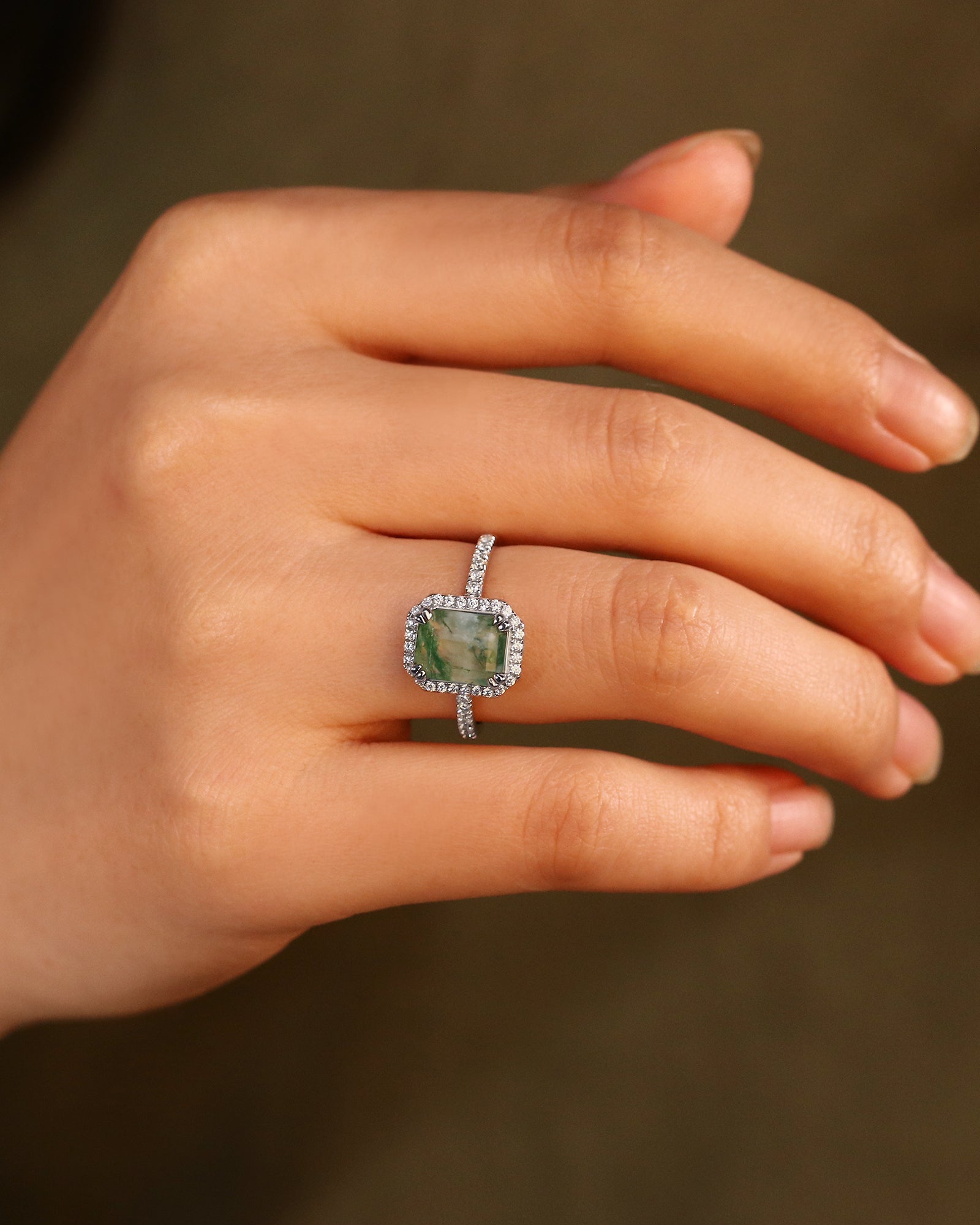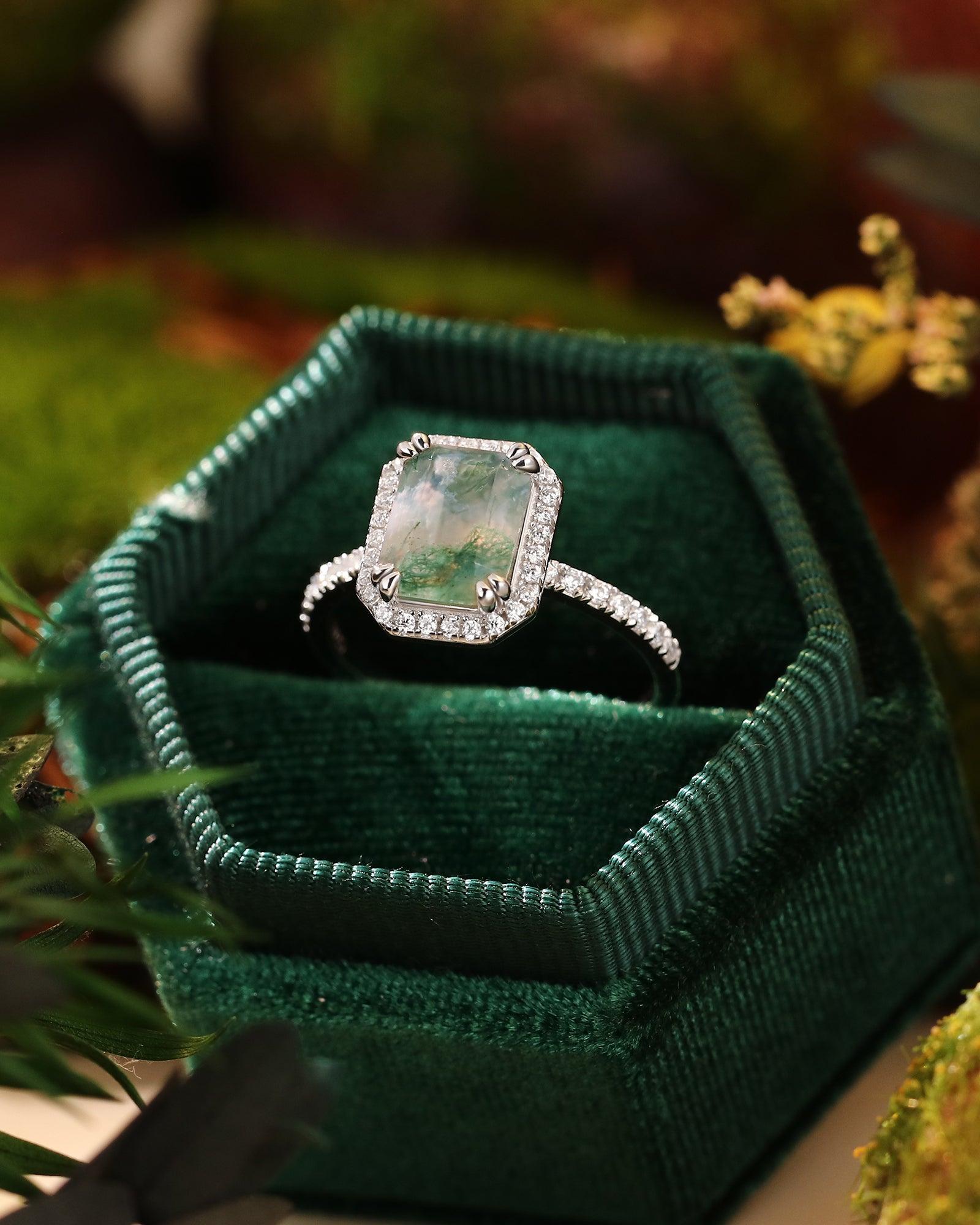 Double Claws Setting Emerald Cut Moss Agate Engagement Ring Moissanite Halo Ring Nature Inspired Ring Promise Bridal Anniversary Gift For Her