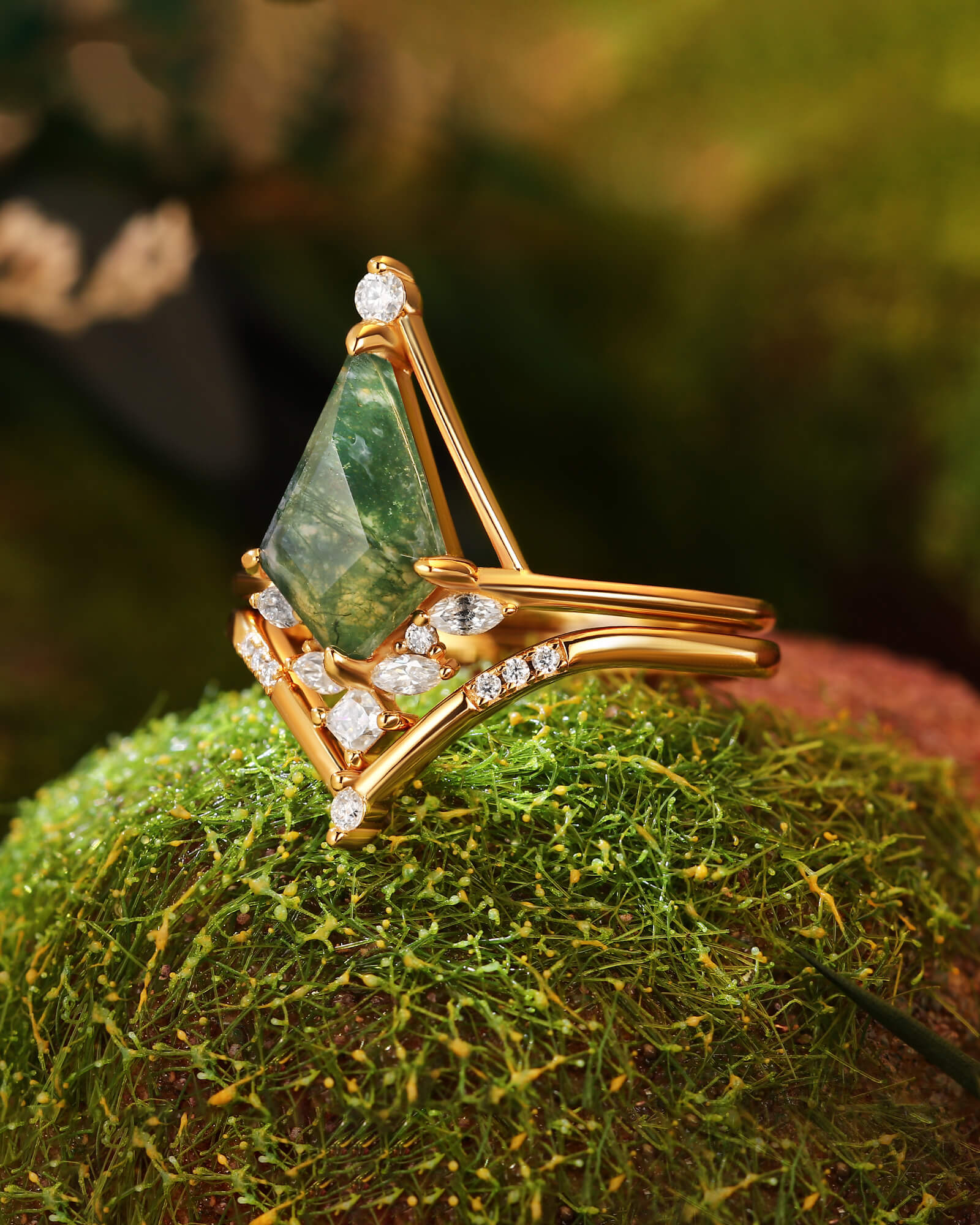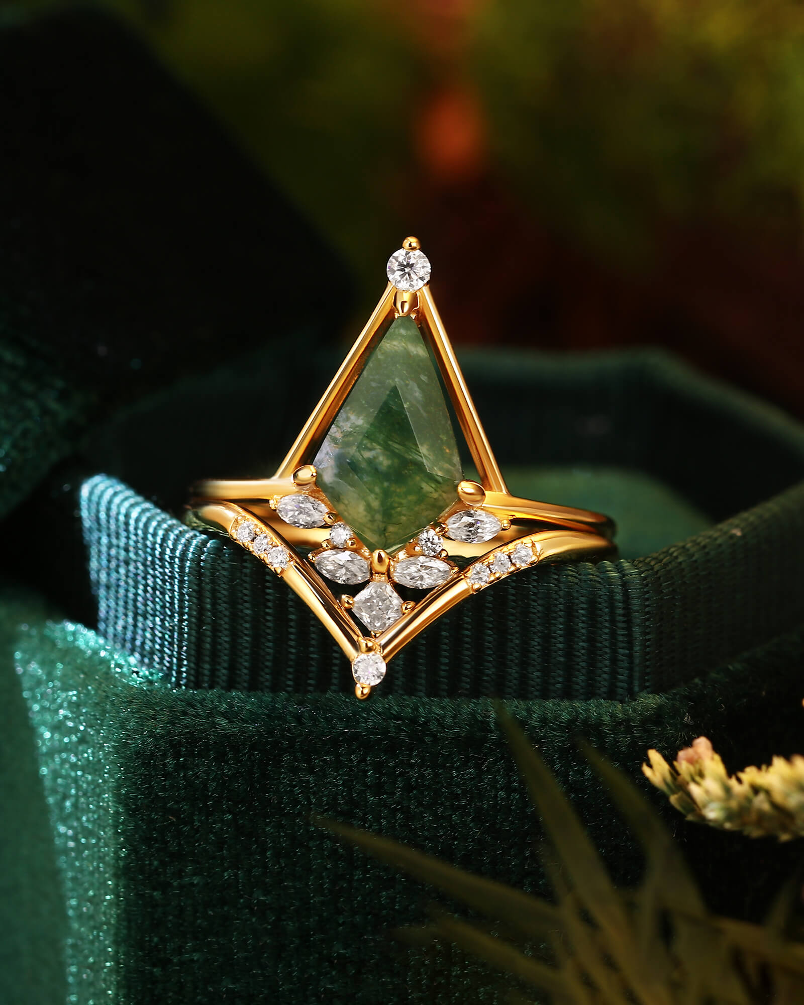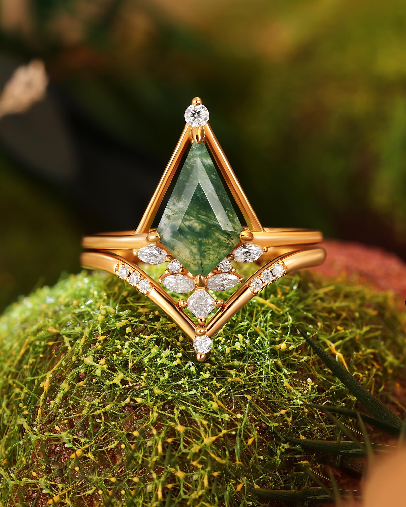 The TREMYLA ring set is a masterful narrative of upward journey and grounded connection. Its centerpiece is a kite-shaped moss agate, a stone that draws the gaze skyward with its dynamic form and serene, moss-filled landscapes—a symbol of growth and aspiration.