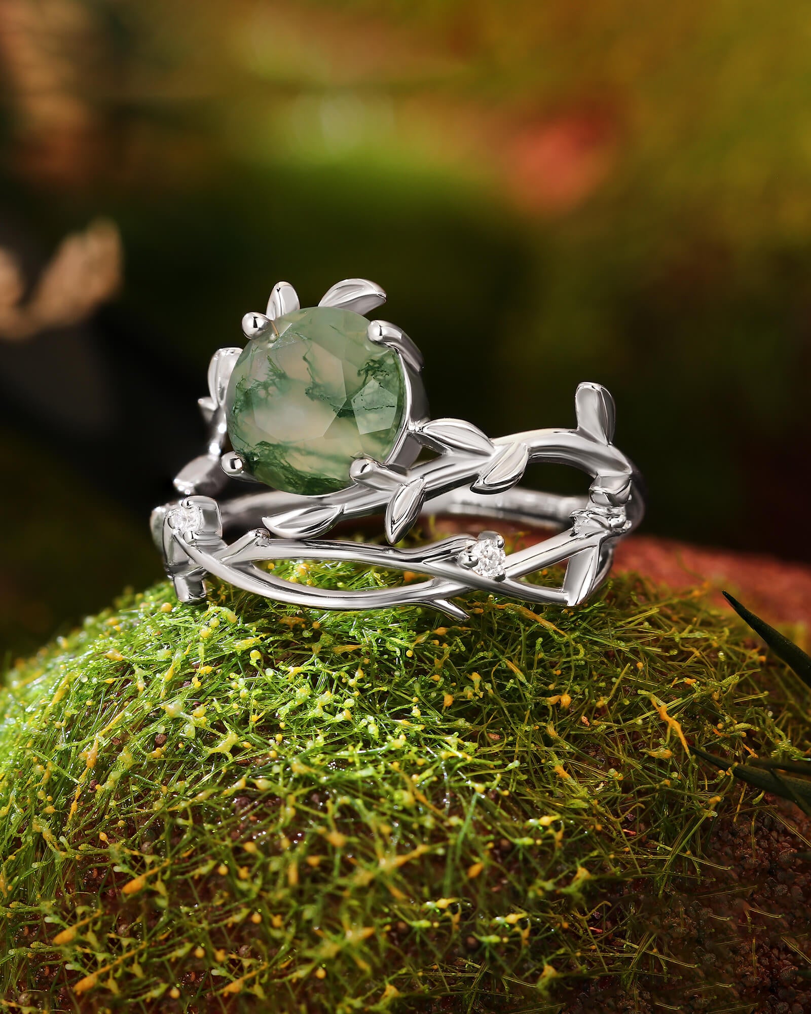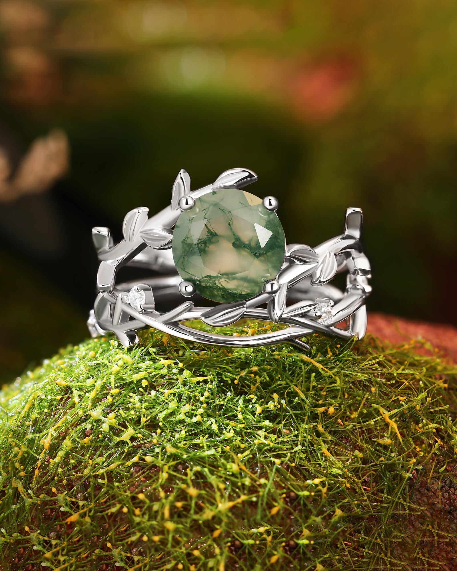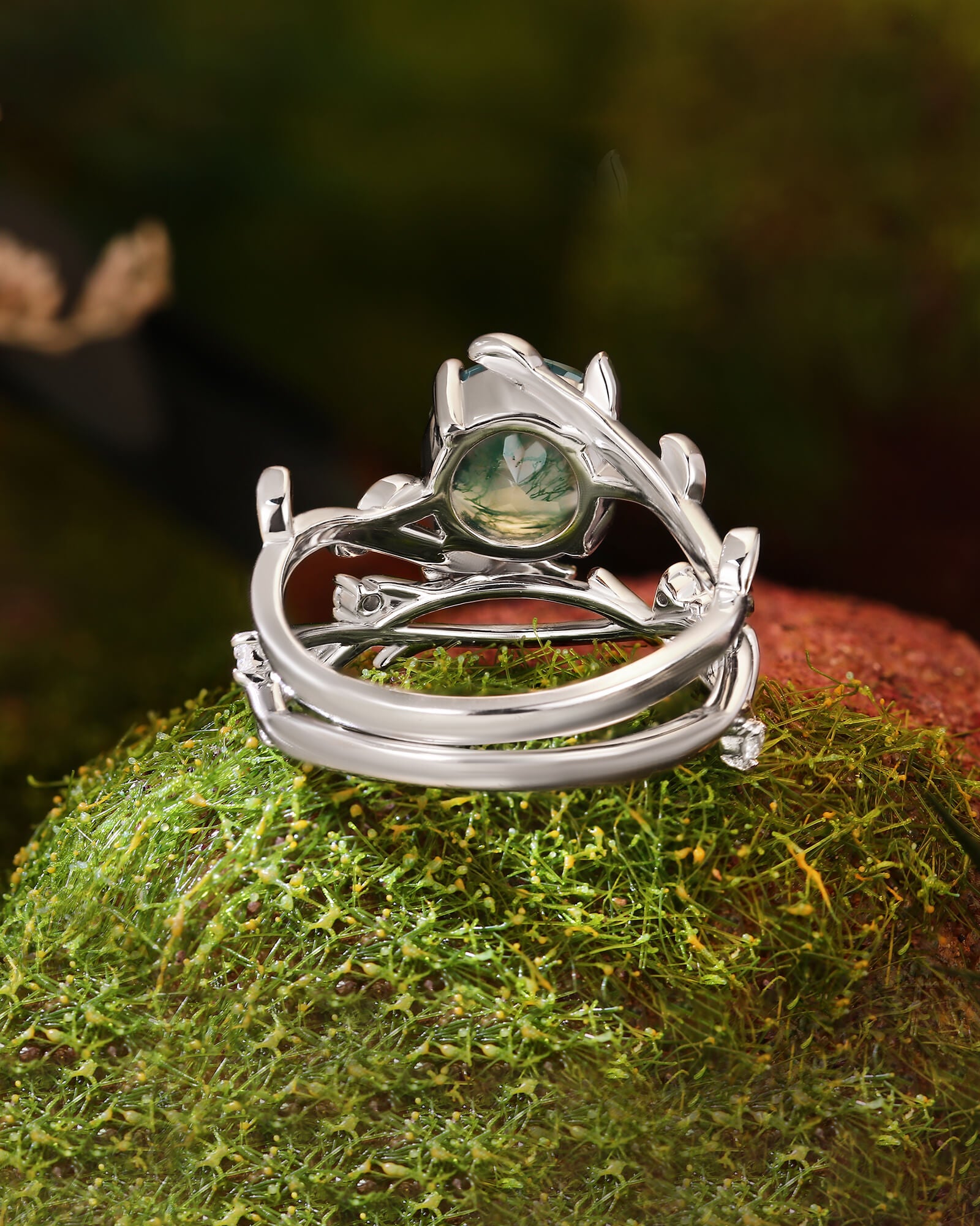 The VERANTHE ring set is a wearable locket from the heart of the forest. At its center lies a round moss agate, a polished sphere that captures a universe of mossy green landscapes and ethereal inclusions—a tranquil world unto itself. This serene globe is cradled not by a plain band, but by a sculpted leaf vine that wraps lovingly around the finger.