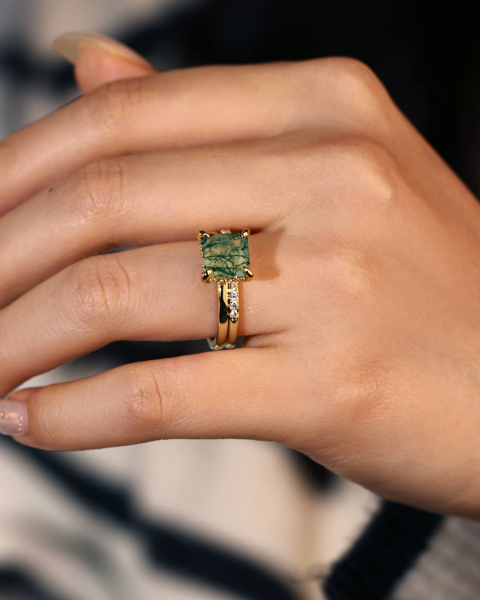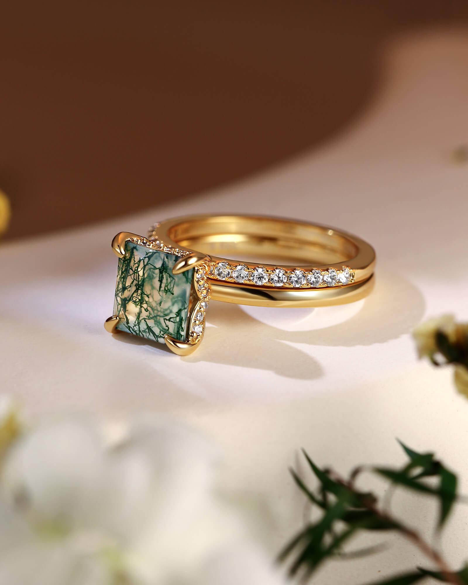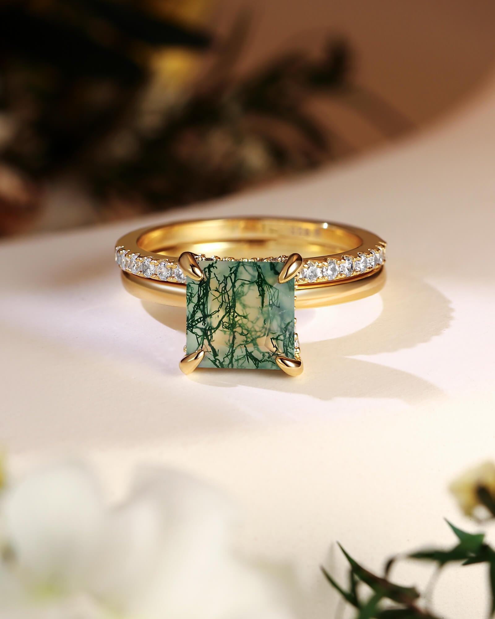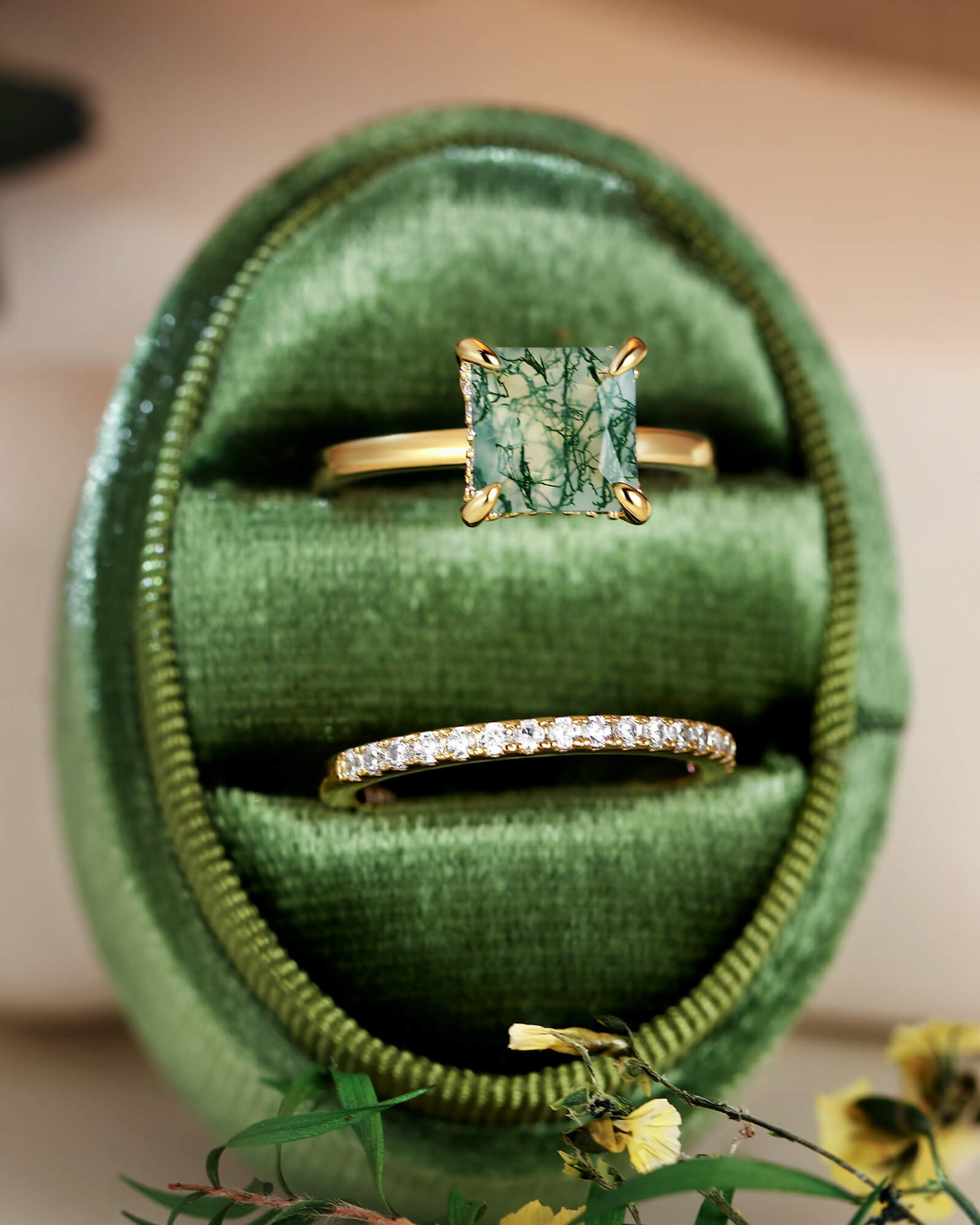 At its heart, a princess-cut moss agate rests in a basket of light—a diamond-paved petal cradle holding a silent, green world. Paired with a half diamond band, this set is a whispered ode to love that is both deeply rooted and scattered with celestial moments.
