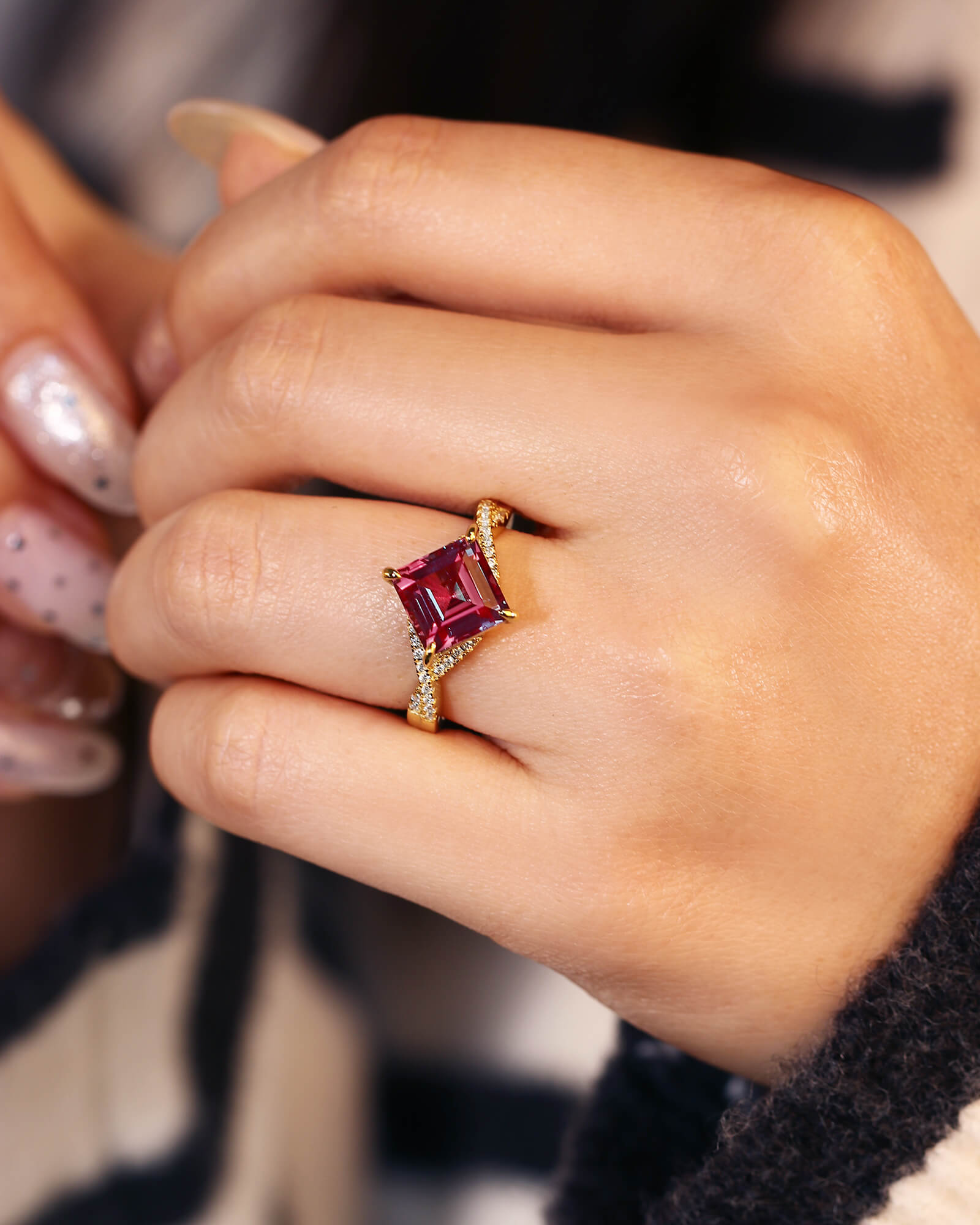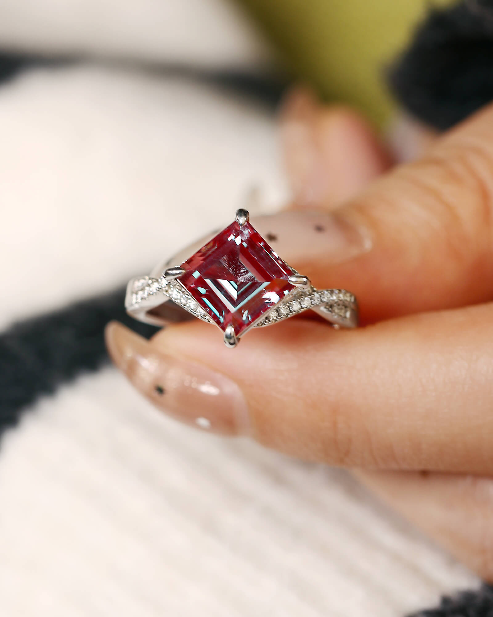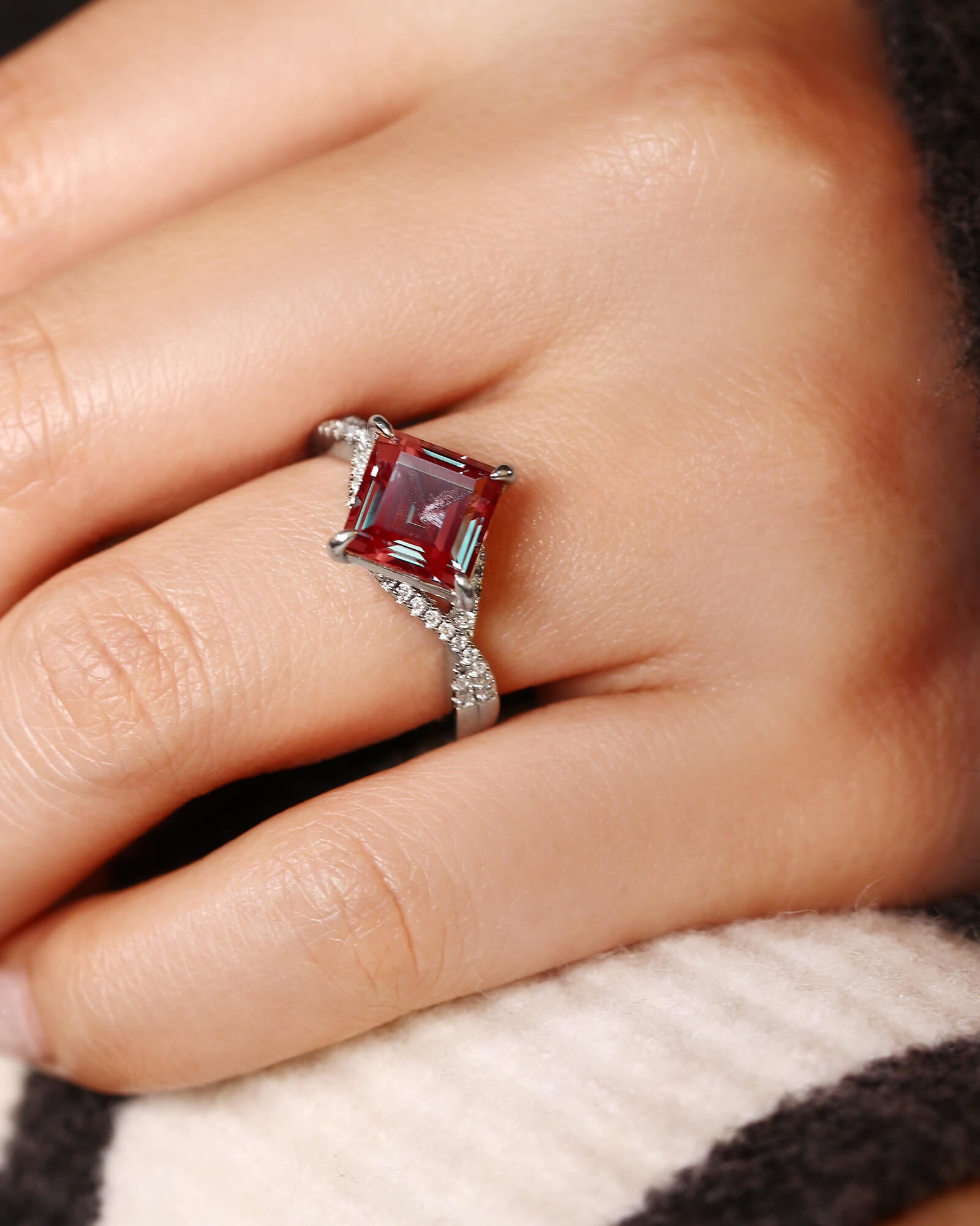 Square Shaped Alexandrite Engagement Ring Moissanite Pave Crossover Shank Ring Color Changing Ring Promise Bridal Anniversary Gift For Her