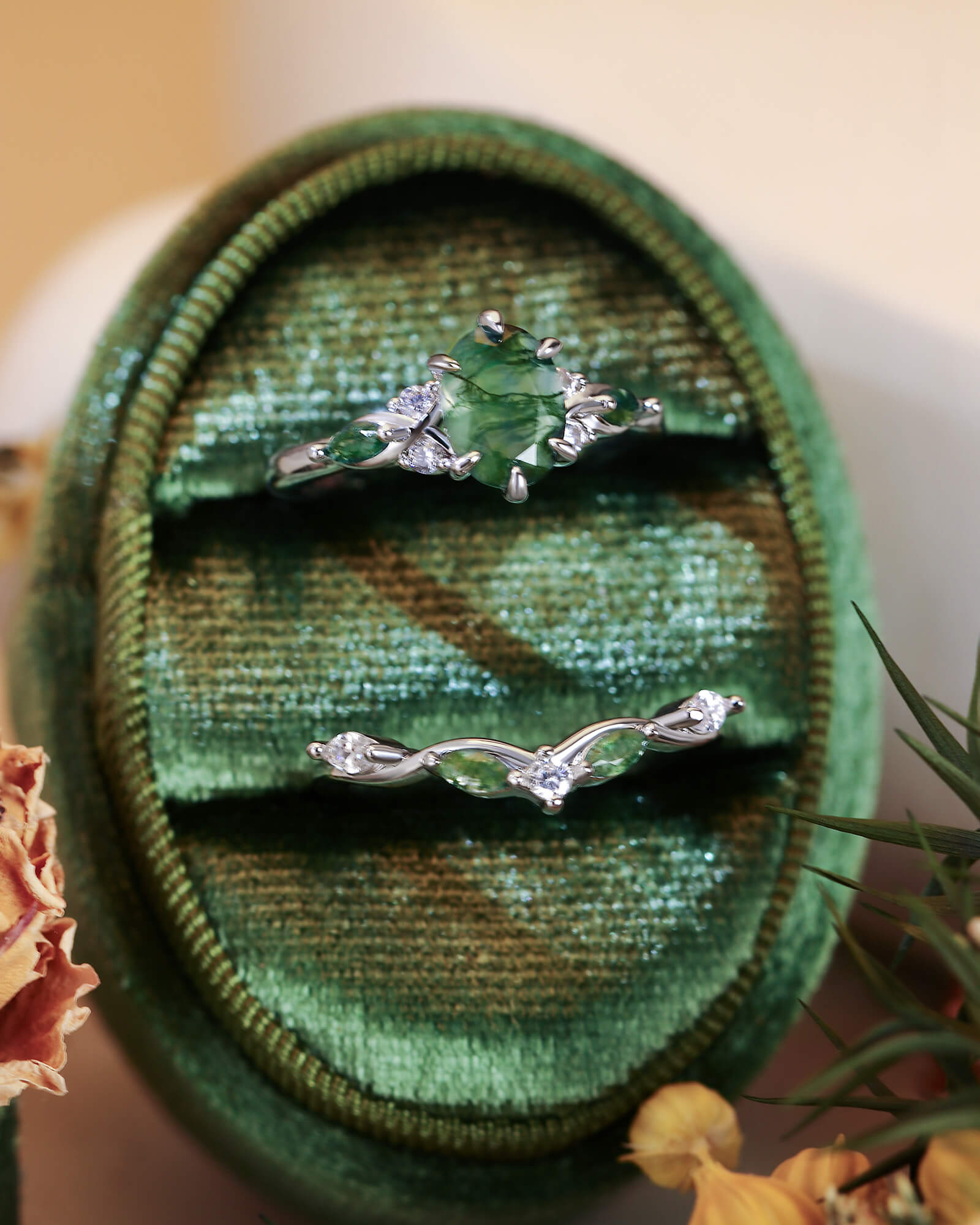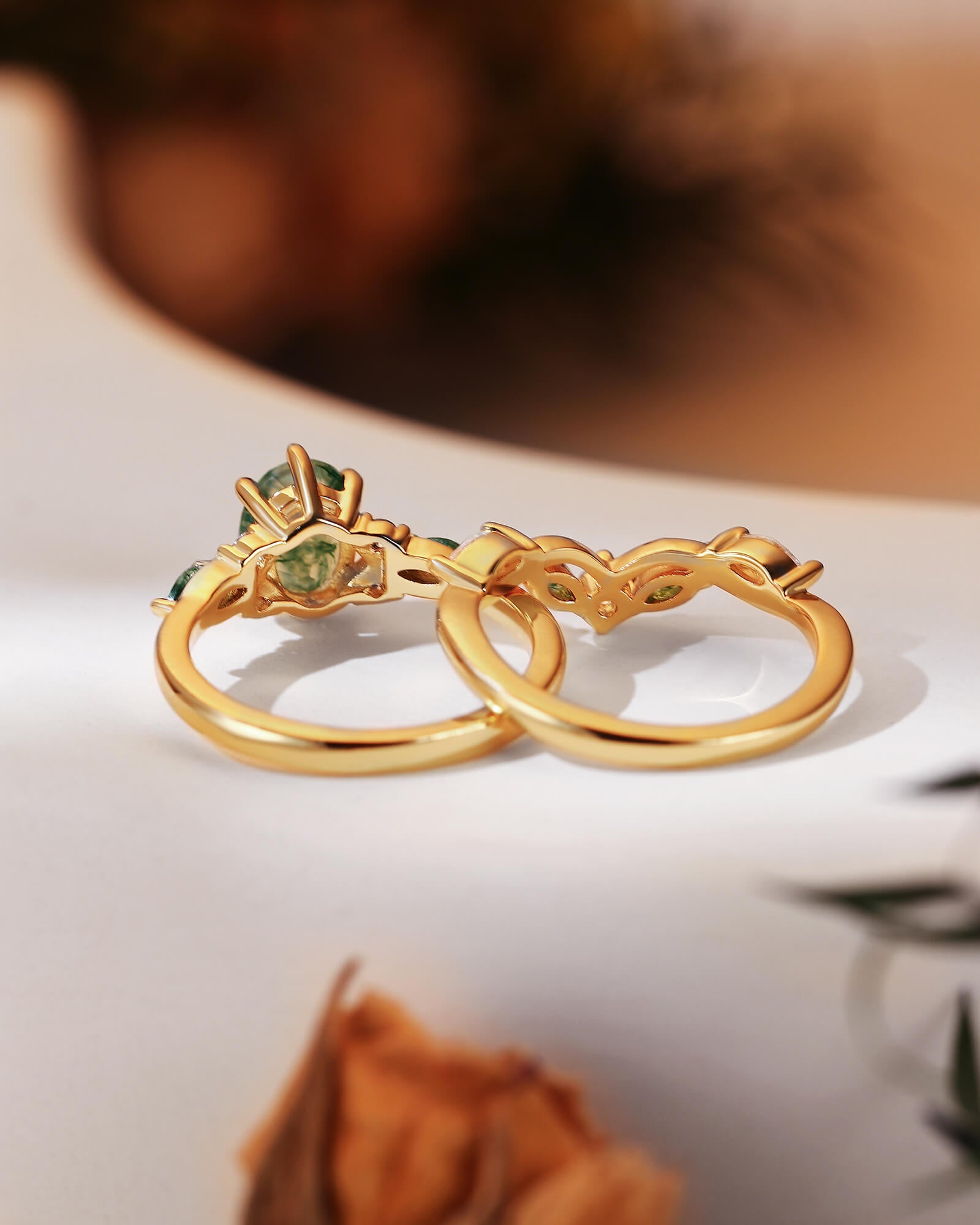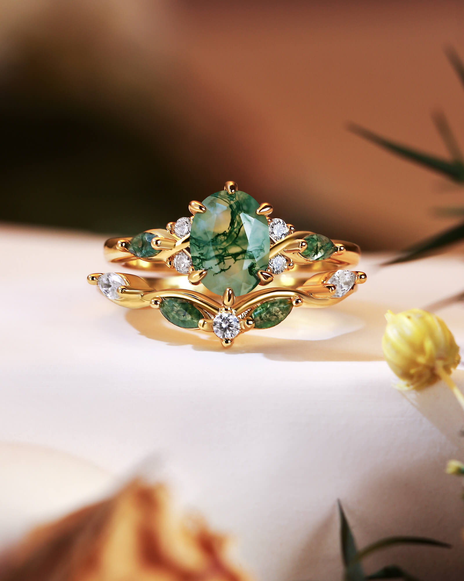 An oval moss agate is flanked by a symmetrical dance of moissanites and smaller moss agates, all embraced by a curved band echoing the same gemstone duet. This set is a complete symphony of organic and celestial light.
