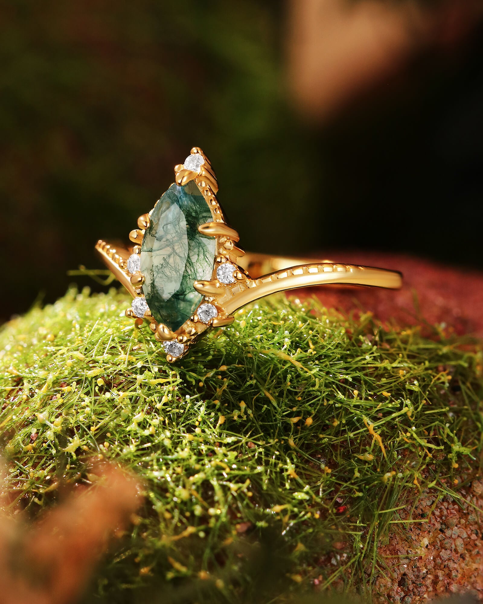 Nature Inspired Marquise Moss Agate Engagement Ring Curved Shank Ring Promise Bridal Anniversary Gift For Her